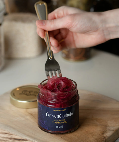 Nakládaná červená cibule v nálevu z našeho vinného octa z dubového sudu, jalovce, skořice a dalšího voňavého koření. Široké možnosti využití ji v kuchyni činí univerzálním doplňkem k masu, salátům, tacos, asijským pokrmům nebo jen tak na chlebu se sýrem.
