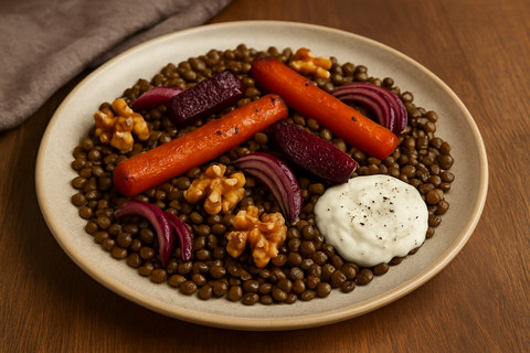 Lehký a výživný salát plný bílkovin, ideální pro jarní restart. Zemitost čočky a pečené zeleniny krásně doplňuje Vinný ocet s černým bezem, který salátu dodá hloubku a osvěžující říz.